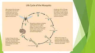 There are approximately 2,700 mosquito species worldwide, with the most common genera being Aedes, Culex, and Anopheles. Mosquitoes feed on nectar and blood from warm-blooded animals. They have distinct morphological features at different life stages, including wing patterns, egg-laying behaviors, larval breathing positions, and pupal development. Mosquitoes damage humans by causing irritation and transmitting diseases like malaria and dengue fever. Management strategies include avoiding bites, eliminating breeding sites, and using nets, repellents, insecticides, and biological controls.