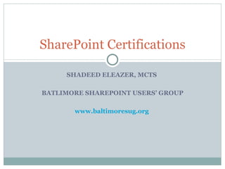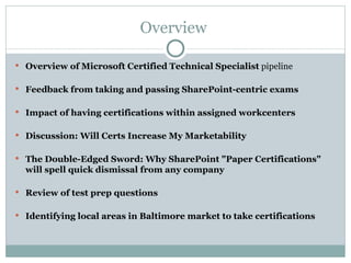 The document provides an overview of Microsoft Certified Technology Specialist (MCTS) certifications specific to SharePoint, detailing exam topics and competencies required for various certifications. It discusses the relevance of certifications in enhancing marketability and job confidence, while also cautioning about the potential pitfalls of perceived expertise. The document highlights local certification opportunities in the Baltimore area and emphasizes the importance of ongoing professional development in SharePoint.