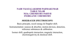 Mossbauer spectroscopy is a technique based on the resonance fluorescence of gamma radiation, allowing the recoil-less emission and absorption of gamma rays by atomic nuclei in solids. It involves essential principles like recoil energy, Doppler shift, and hyperfine interactions, which include isomer shift, quadrupole splitting, and magnetic splitting. The method is widely applied in fields like inorganic chemistry and biology to study chemical bonding and various nuclear properties.