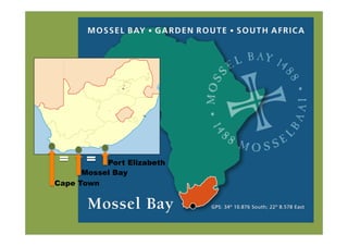 Mossel Bay is a unique destination offering a variety of activities including beaches, game watching, and adventure sports like scuba diving and shark cage diving. It is known for its rich history as the birthplace of modern human behavior, art, and advanced technology. The area caters to different budgets with options for accommodation, entertainment, and dining.