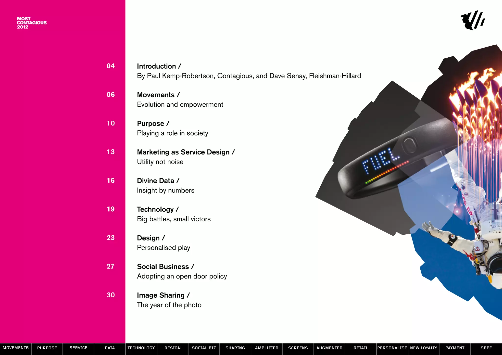 The Most Contagious 2012 report discusses the evolution of branding and marketing, emphasizing the growing importance of purpose-driven approaches where brands operate as social citizens. It highlights trends such as the impact of social media, the integration of technology in retail, and the rise of crowdfunding platforms like Kickstarter. The document showcases successful examples of brands that have embraced their societal roles, offering meaningful services to consumers while navigating the changing landscape of business and communication.