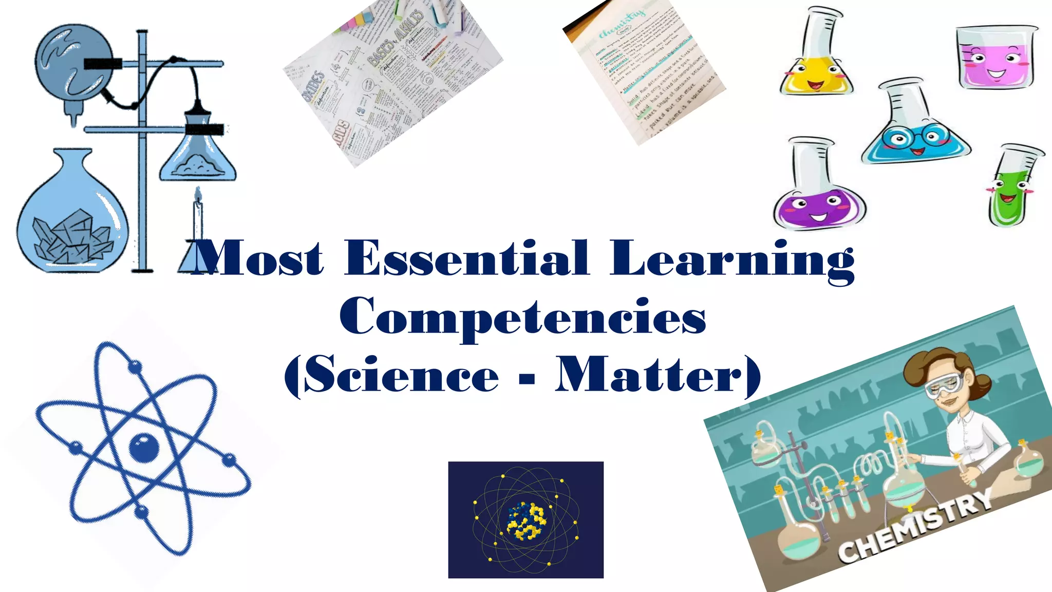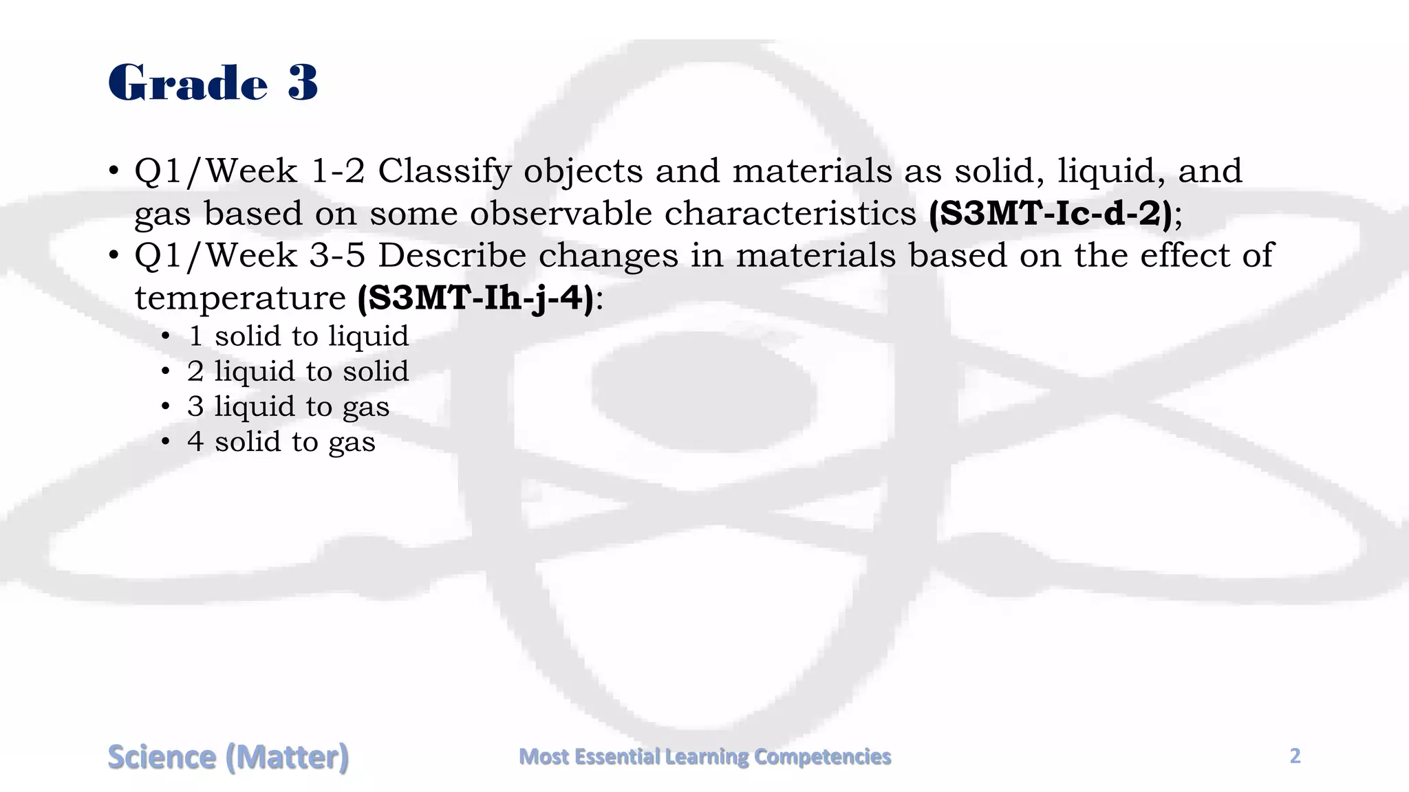The document outlines the essential learning competencies for science focusing on the topic of matter across various grade levels, from Grade 3 to Senior High School (SHS). It details specific learning goals, such as classifying materials, describing changes in states, and investigating properties of substances and solutions. Each grade level's objectives are organized by week, covering fundamental topics that progress in complexity, aligning with educational standards.