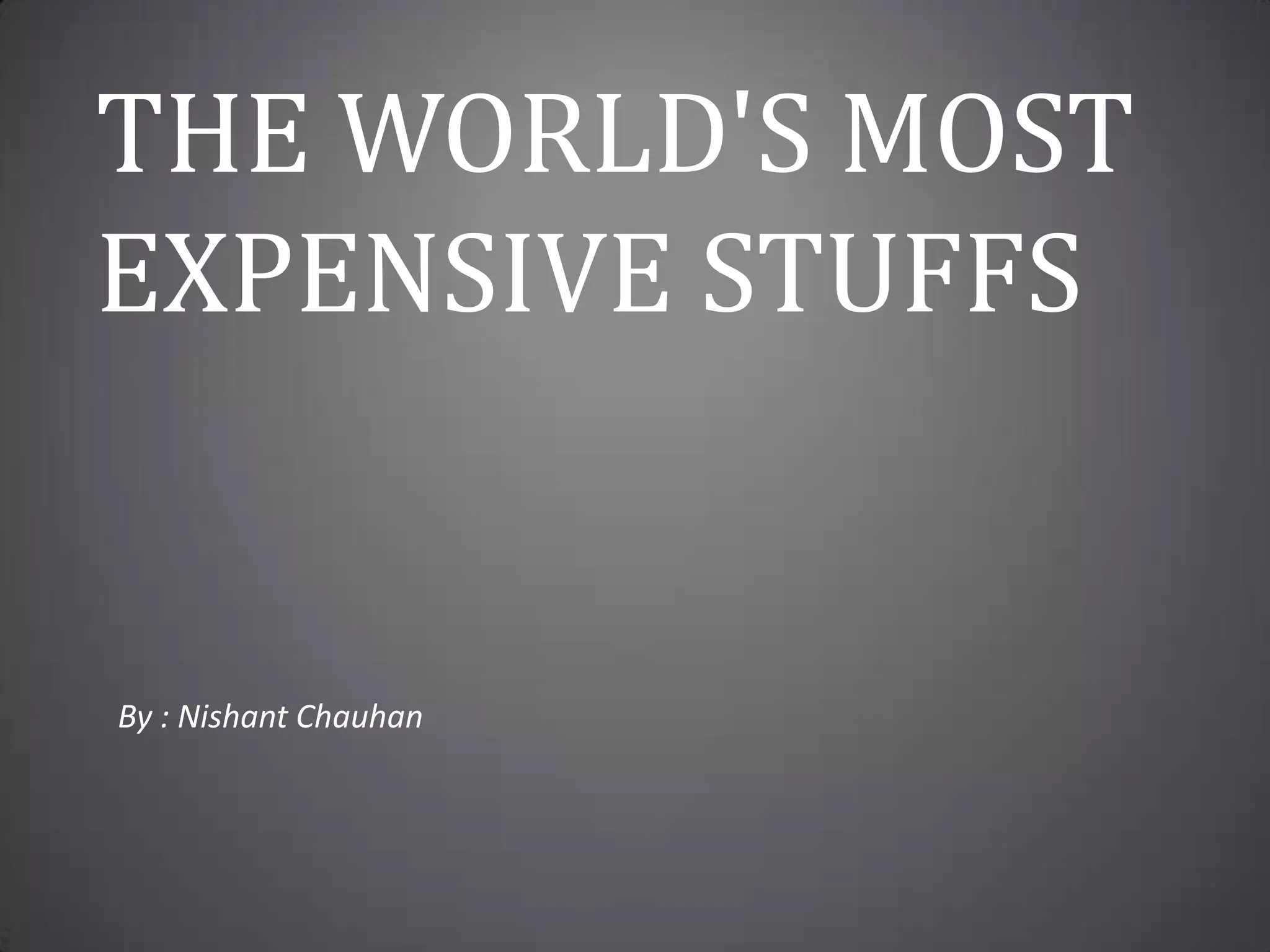 This document lists the world's most expensive items in various categories, including cigars, champagne, hotel rooms, bicycles, golf clubs, wine, chess sets, cameras, speakers, televisions, phones, pianos, domain names, rings, cars, watches, drawings, and sculptures. The most expensive item listed is Alberto Giacometti's sculpture "L'Homme qui marche I" which sold at auction for $104.3 million.