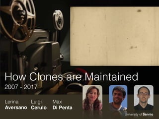 This document presents an empirical study on the maintenance of software code clones from 2007 to 2017, challenging the perception that cloning is a risky practice. It finds that most cloned code is consistently maintained during bug fixing and evolution, supporting the idea that code clones can be beneficial. The study utilizes clone detection and co-change analysis to examine how clones evolve in software repositories.