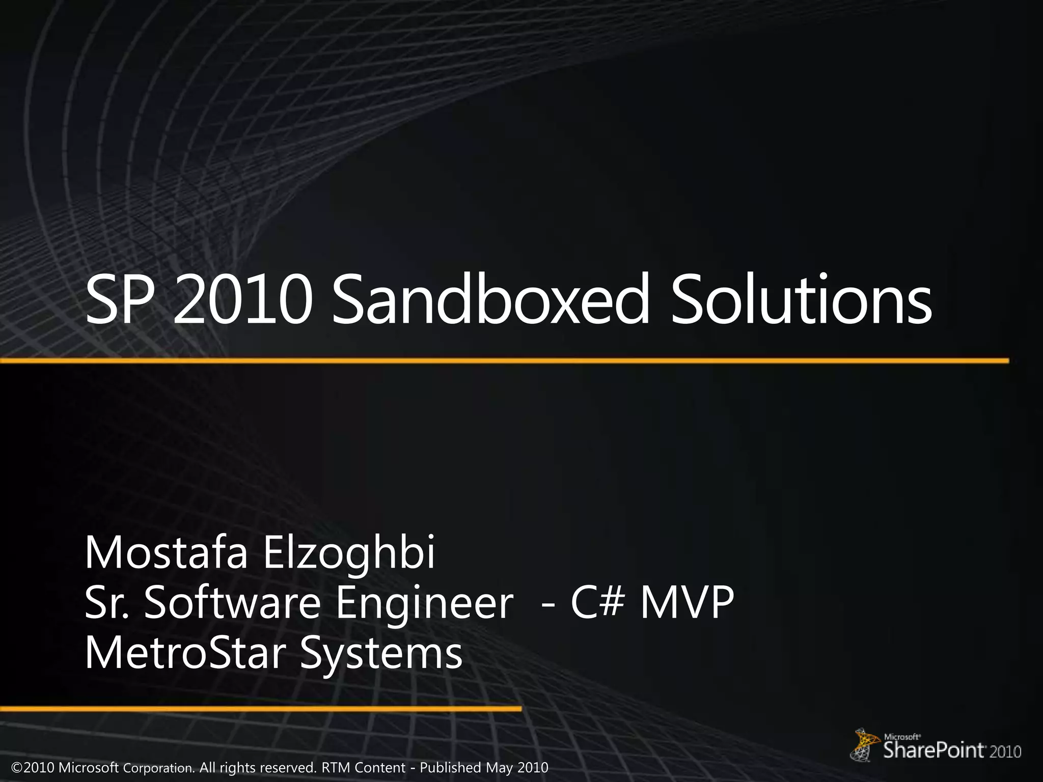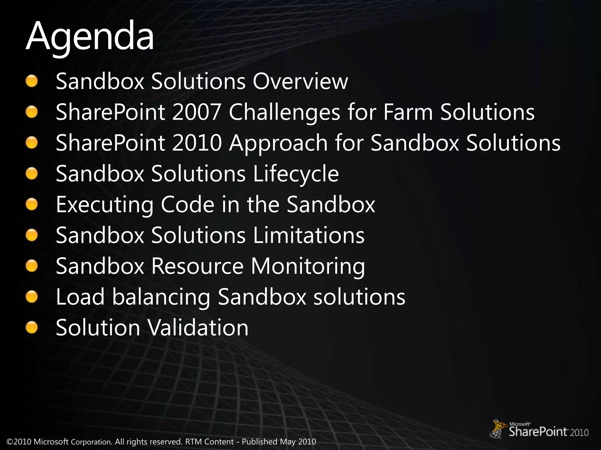 This document discusses sandboxed solutions in SharePoint 2010. It provides an overview of sandboxed solutions, outlines challenges with farm solutions in SharePoint 2007, and describes SharePoint 2010's approach of sandboxed solutions. Key points covered include the sandboxed solution lifecycle, how code executes in the sandbox, limitations of sandboxed solutions, sandbox resource monitoring, load balancing sandboxed solutions, and solution validation.