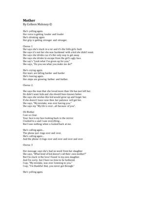 This song describes a dysfunctional relationship between a mother and daughter. The mother is verbally and physically abusive when she drinks, blaming her daughter for ruining her life. As the daughter grows up, she realizes her mother's mistreatment and lack of care. Now as an adult, the daughter has distanced herself from her mother and found love in her own daughter instead, breaking the cycle of abuse.