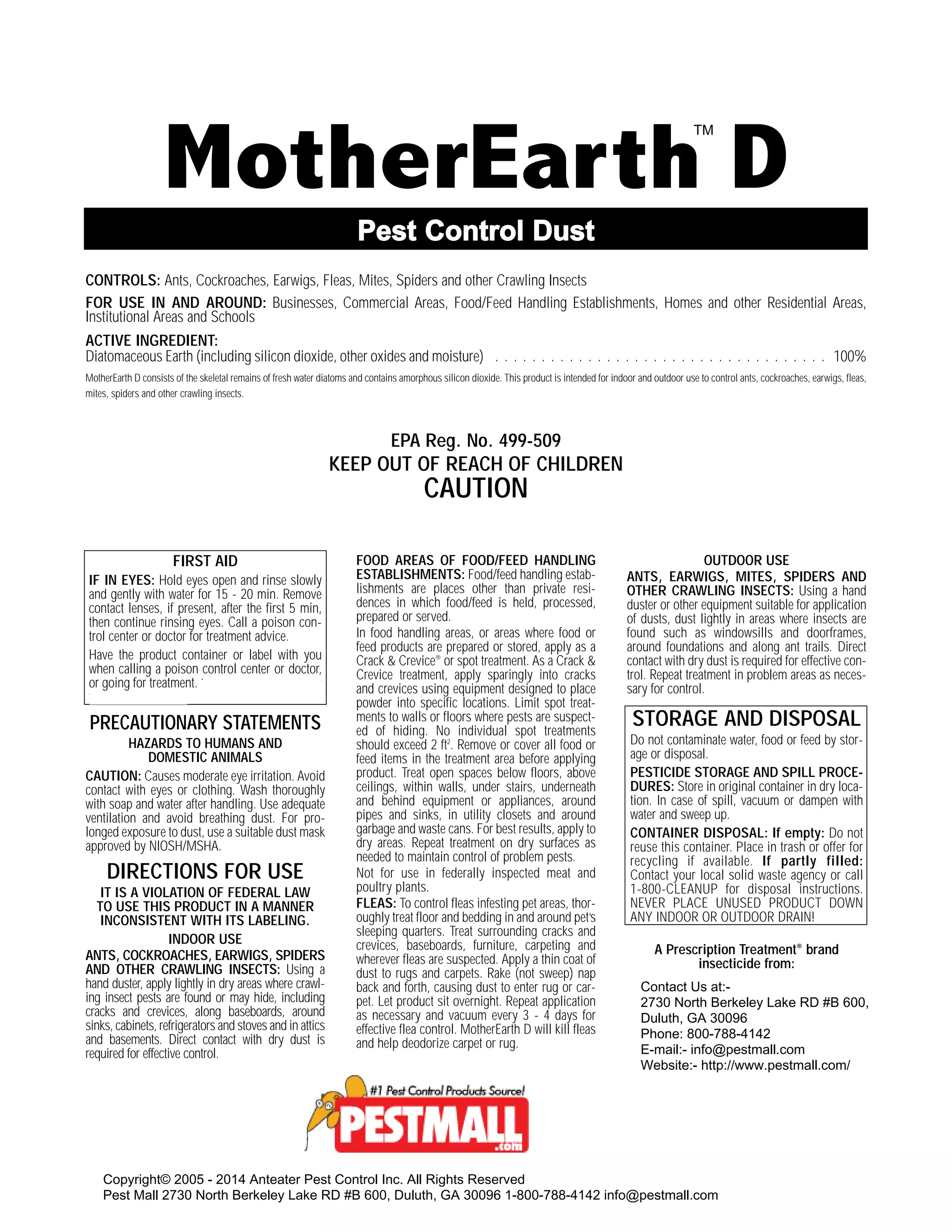 Motherearth D Pest Control Dust is designed to control various crawling insects such as ants, cockroaches, and fleas, utilizing diatomaceous earth as its active ingredient. It is suitable for both indoor and outdoor use in multiple settings, including homes and food handling establishments, with specific application directions provided for effective pest management. The product should be handled with caution due to potential eye irritation, and users are advised to follow safety protocols and disposal guidelines.