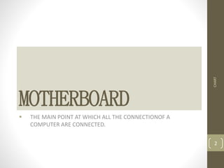 The document discusses the main components and parts of a motherboard. It lists the motherboard as the central connection point for all components in a computer. It then lists and describes 12 common parts found on a motherboard, including the power supply, memory, control unit, graphic cards, hard drive, heat sink, and microprocessor. It provides charts and diagrams to illustrate motherboard components and sockets for AMD and Intel motherboards.