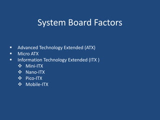 A motherboard is the main circuit board in a computer that connects the central processing unit and RAM to other components like expansion cards and ports. It contains chipsets to interface with peripherals and components like the CPU socket, memory slots, expansion slots for graphics and other cards, and front panel connectors. Key factors in motherboards include the form factor like ATX or Mini-ITX and components like the northbridge and southbridge chips that connect different parts of the system.