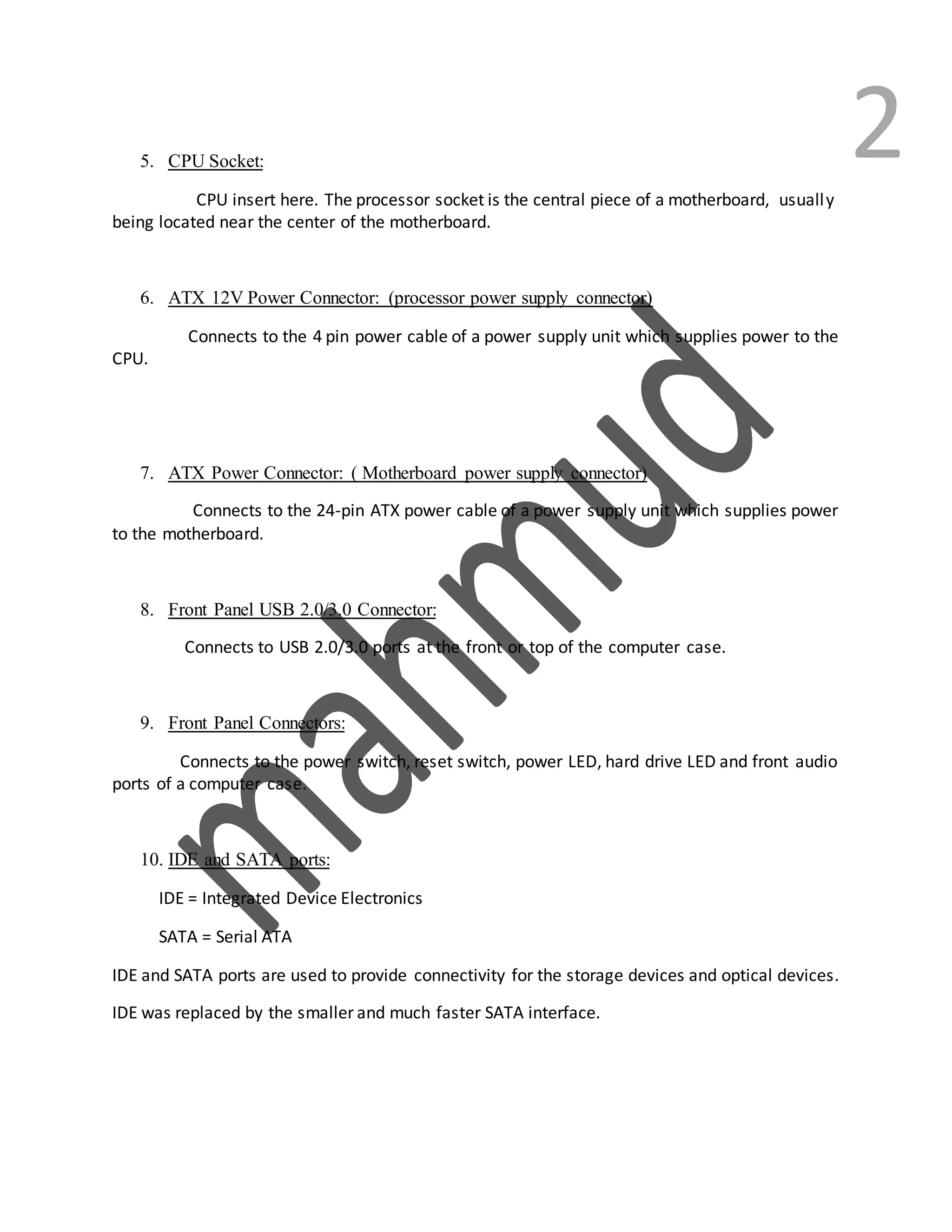 The document provides information about motherboard components and their functions, as well as how to troubleshoot motherboard failures. It discusses the main components of a motherboard including the back panel connectors, PCI slots, northbridge, southbridge, CPU socket, power connectors, and RAM slots. It then describes common motherboard failure symptoms and provides a multi-step process for troubleshooting, which involves checking for physical damage, voltages, and signals before attempting to replace failed components.