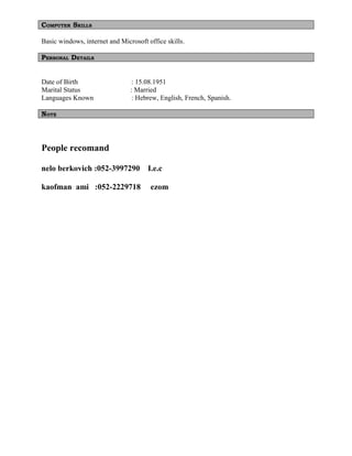 Elsam Mordehai has over 35 years of experience in mechanical installation and maintenance. He has worked as a technician and foreman in Israel, Venezuela, and Angola, installing systems like turbines, pumps, cooling facilities, and natural gas piping for power stations. He received training in mechanics, electricity, and working with natural gas. He is proficient in Hebrew, English, French, and Spanish.