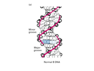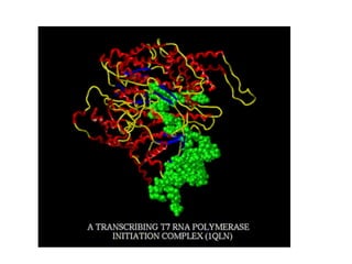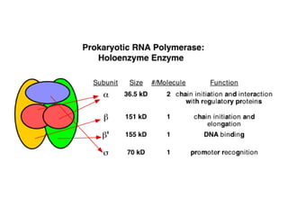 The document provides an overview of RNA transcription and translation processes, emphasizing the role of various types of RNA, including mRNA, rRNA, and tRNA. It details the steps of transcription and the functions of RNA polymerases, including initiation, elongation, and termination, as well as methods for studying transcription factors and promoter regions in both prokaryotes and eukaryotes. Additionally, it discusses the interactions between DNA-binding proteins and DNA, illustrating the mechanisms of gene regulation.