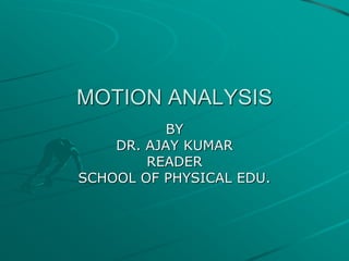 This document provides an analysis of walking as a motor skill. It begins by describing walking and breaking it down into its constituent elements. It then identifies the joints, muscles, and anatomical and mechanical principles involved. These include principles related to inertia, levers, stability, and friction. The objectives of the analysis are to understand walking mechanically and identify principles that can improve efficiency and avoid injuries. Both qualitative and quantitative analysis methods are described. The document analyzes walking in detail by applying various mechanical principles to explain the motion.