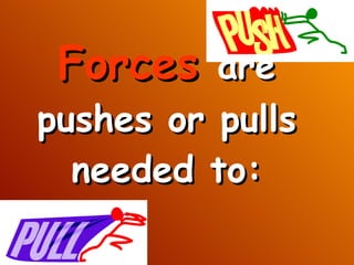 TEKS 6.8B, 6.8C, and 6.8D outline standards related to identifying changes in an object's position, direction, and speed when acted on by unbalanced forces, calculating average speed using distance and time measurements, and measuring and graphing changes in motion. Forces are needed to start or stop an object's motion or change its speed or direction. Speed is calculated by dividing distance by time and can be shown through graphs of changing motion over time. Forces can cause an object's speed to increase, decrease, or stop depending on whether the net force is balanced or unbalanced.