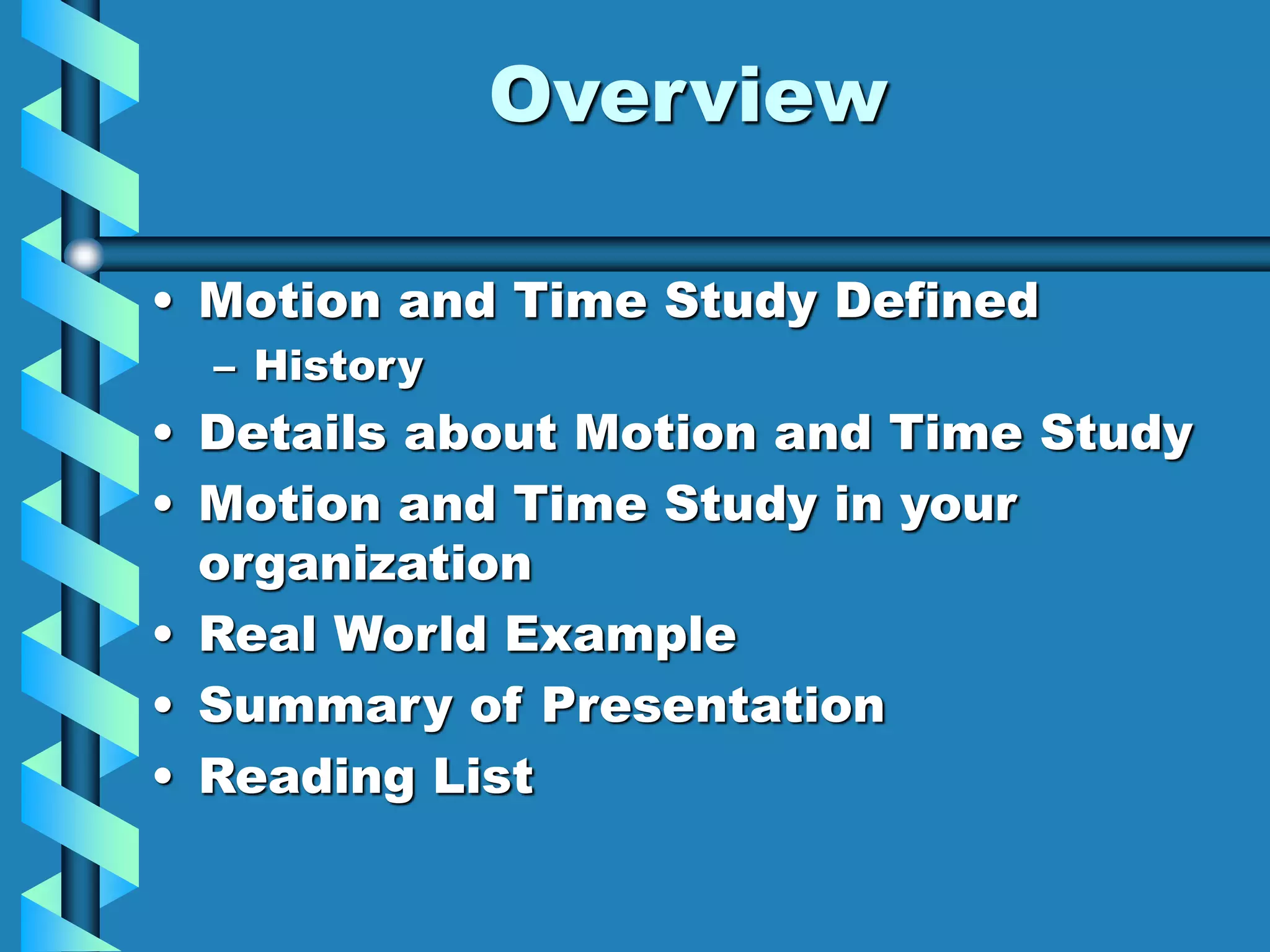 This document provides an overview of motion and time study. It discusses the history and development of motion and time study, including the contributions of Frank and Lillian Gilbreth and Frederick Taylor in the late 19th century. The document also describes how motion and time studies are conducted, including the tools used such as motion cameras, stopwatches, and software. Finally, it provides a real-world example of how Cooper Hospital used time study to improve the efficiency of its human resources department.
