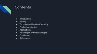 The document provides an overview of motion capture (mocap), detailing its introduction, history, techniques, applications, advantages, and disadvantages. It highlights the evolution of mocap from basic systems to advanced technology and outlines various applications in entertainment, medicine, sports, and science. The document emphasizes both the benefits of realistic movement recreation and the challenges involved with hardware and situational requirements.
