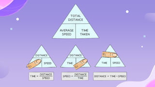 The document provides an overview of motion concepts, including speed, velocity, and acceleration, and explains their calculations. It emphasizes the differences between scalar and vector quantities through distance-time and speed-time graphs, illustrating how these graphs can represent constant and changing speeds. Additionally, it includes worked examples and practical applications of these concepts in real-life scenarios.