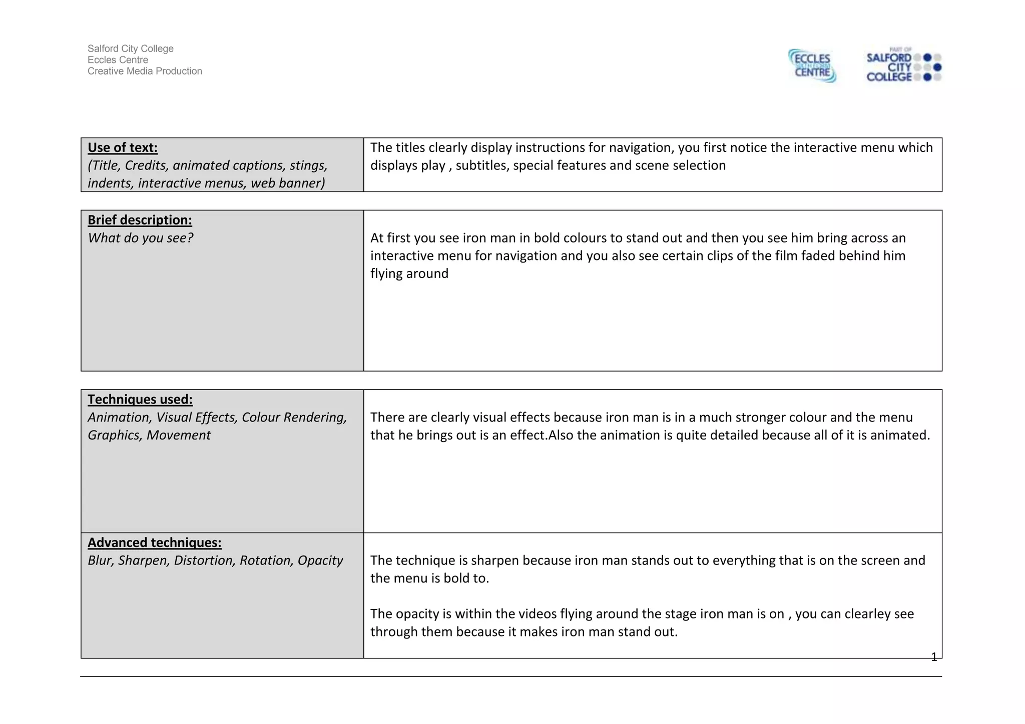 The interactive Iron Man DVD menu displays play, subtitles, special features and scene selection options. Iron Man is animated and in bold colors to stand out against faded film clips playing behind him. Visual effects and animation are used to make Iron Man pop out from the menu. Techniques like sharpening and opacity are applied to Iron Man and the menu to make them stand out clearly. The video format is likely HD to match the high quality of the film, with a 16:9 screen ratio and resolution suitable for HD display.