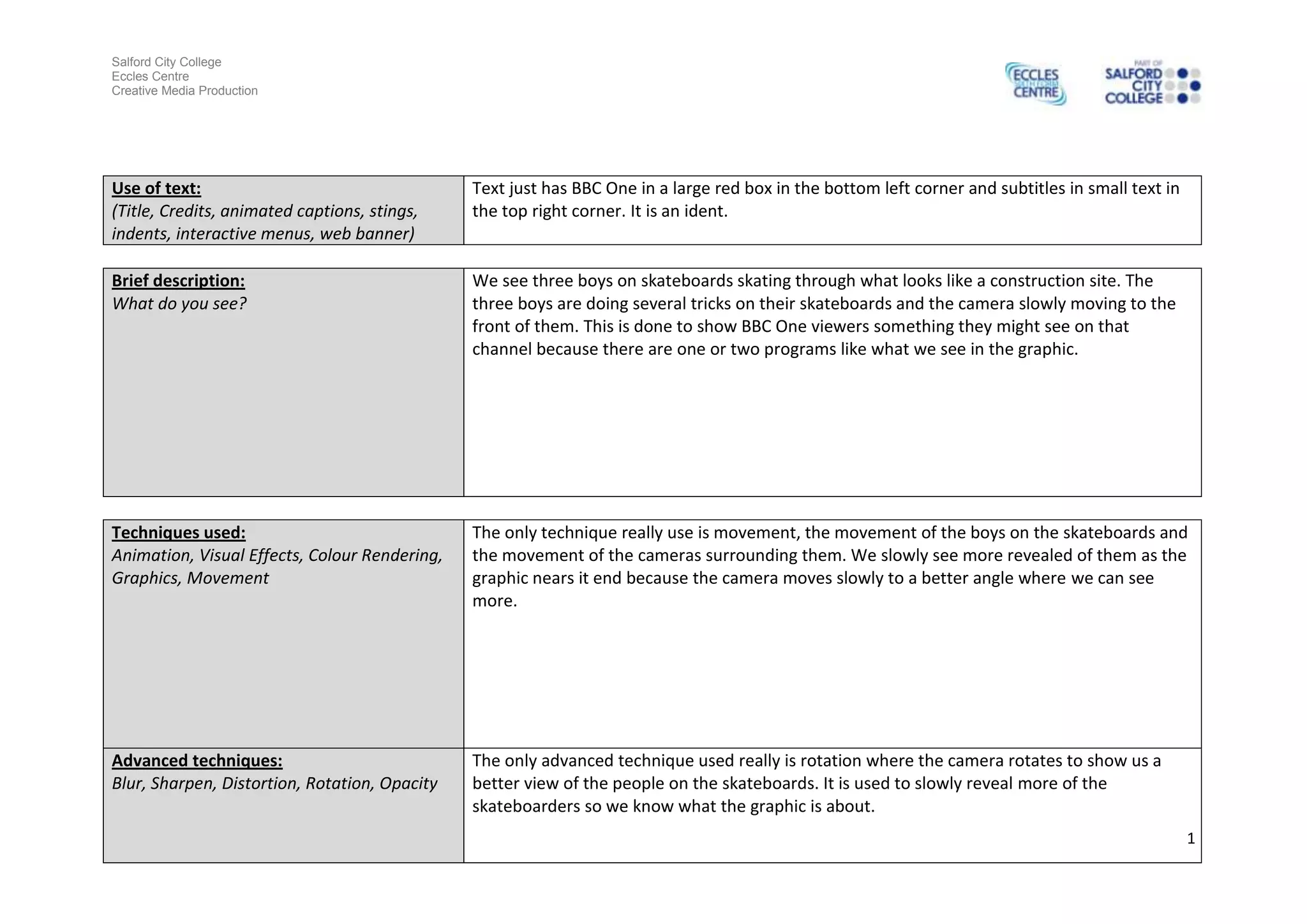The document summarizes a BBC ident that shows three boys skateboarding through a construction site. The ident uses movement of the skateboarding boys and camera to slowly reveal more of them. The only advanced technique is camera rotation to show a better view of the skateboarders. The ident is standard definition video format with a 4:3 screen ratio and frame rate of 25 fps, using Xvid compression for a smaller file size at the cost of lower quality.