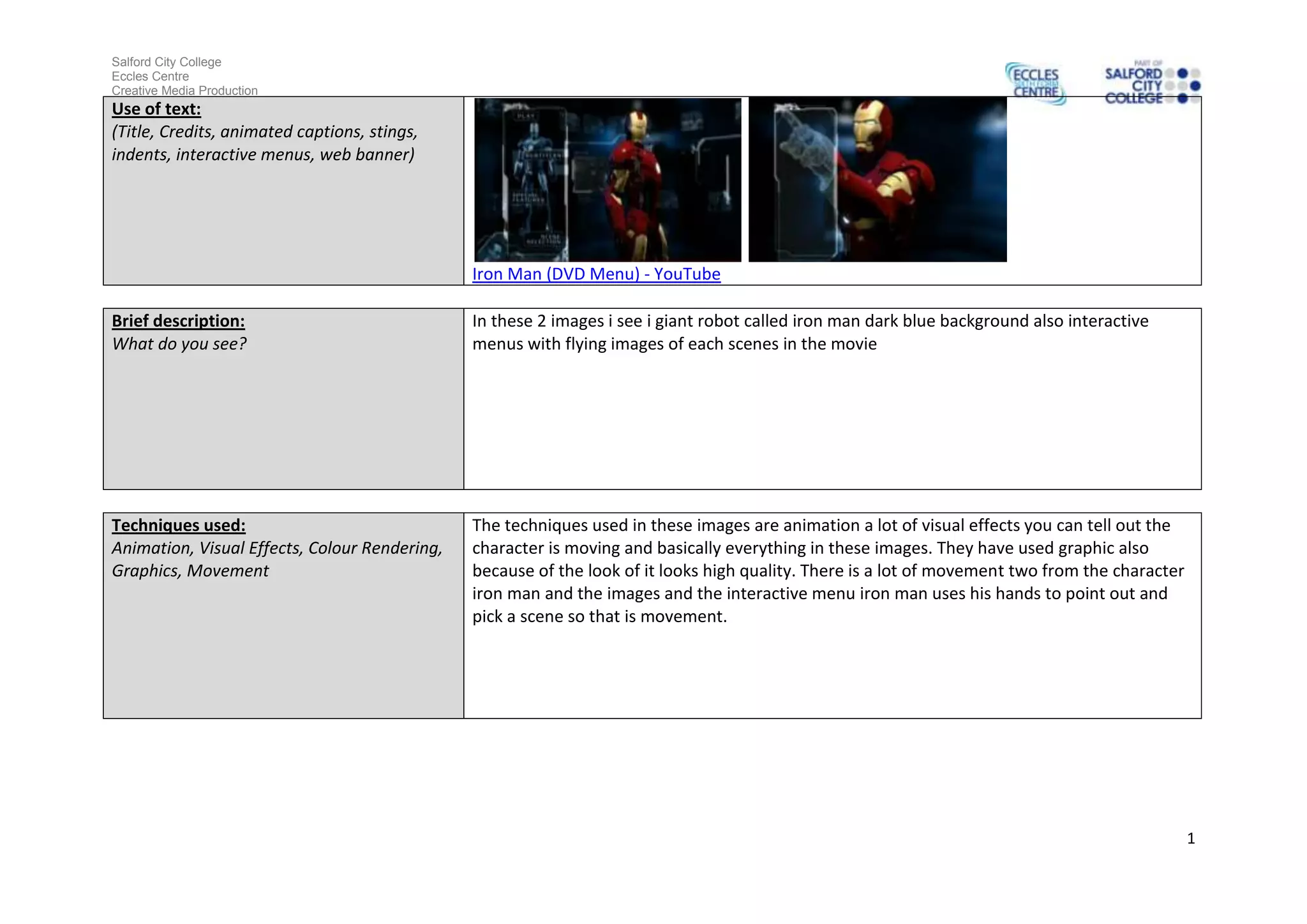 The document summarizes techniques used in the DVD menu for the movie Iron Man, including animation, visual effects, color rendering, graphics, and movement. It notes the use of techniques like blurring and darkening the background to make Iron Man stand out. Technical elements discussed include screen ratio, resolution, and compression. Key terms explained include motion graphics, compositing video, interactive menus, and video format.
