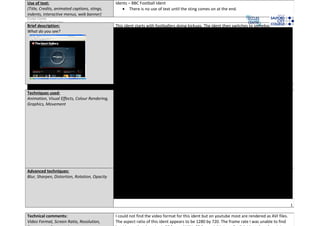 This document provides a description and analysis of a BBC Football ident. It notes that the ident features footballers doing kickups that form circles, with blurred ball movement. Colour rendering and motion graphics are used to keep the circular motif and draw attention to the red ball. Blur, sharpening, distortion, and rotation are advanced techniques employed. However, the exact video format and frame rate could not be determined.