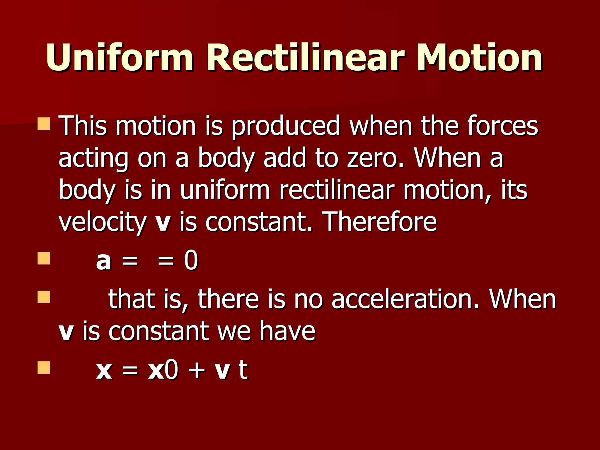 Uniform rectilinear motion refers to motion with constant velocity. When forces acting on an object sum to zero, the object has uniform rectilinear motion. Uniformly accelerated rectilinear motion occurs when the net force acting on an object is constant, giving it a constant acceleration. Free fall under gravity is an example of uniformly accelerated motion, where the acceleration due to gravity is about 9.8 m/s^2.
