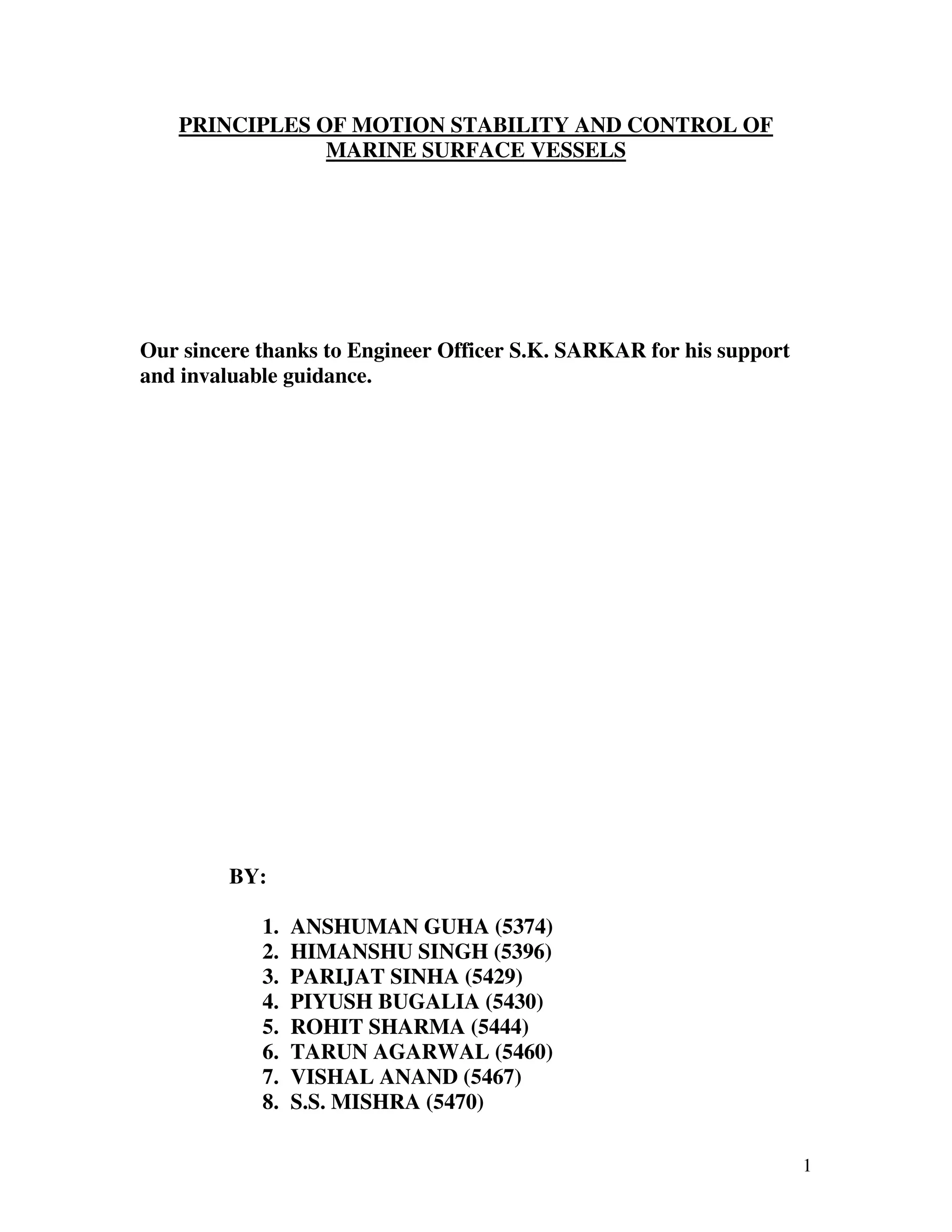 This document discusses principles of motion stability and control for marine surface vessels. It covers topics like heading control, track keeping, dynamic positioning, and roll stabilization. Mathematical modeling is used to analyze ship motions and develop control systems, with newer algorithms discussed theoretically. Simulation software is also utilized to obtain results on motion stability and control codes.
