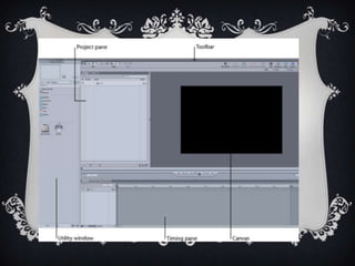 The document discusses the key components of the Motion software interface that were used to create an animation about social media usage. It describes how the Project Pane was used to arrange images in the correct order to match the voiceover, the Toolbar was used to add masks and backgrounds, and the Canvas allowed viewing and adjusting the animation playback. It also explains that the Utility Window imported images like logos and the Timing Pane functioned similar to a timeline for editing clips.