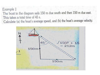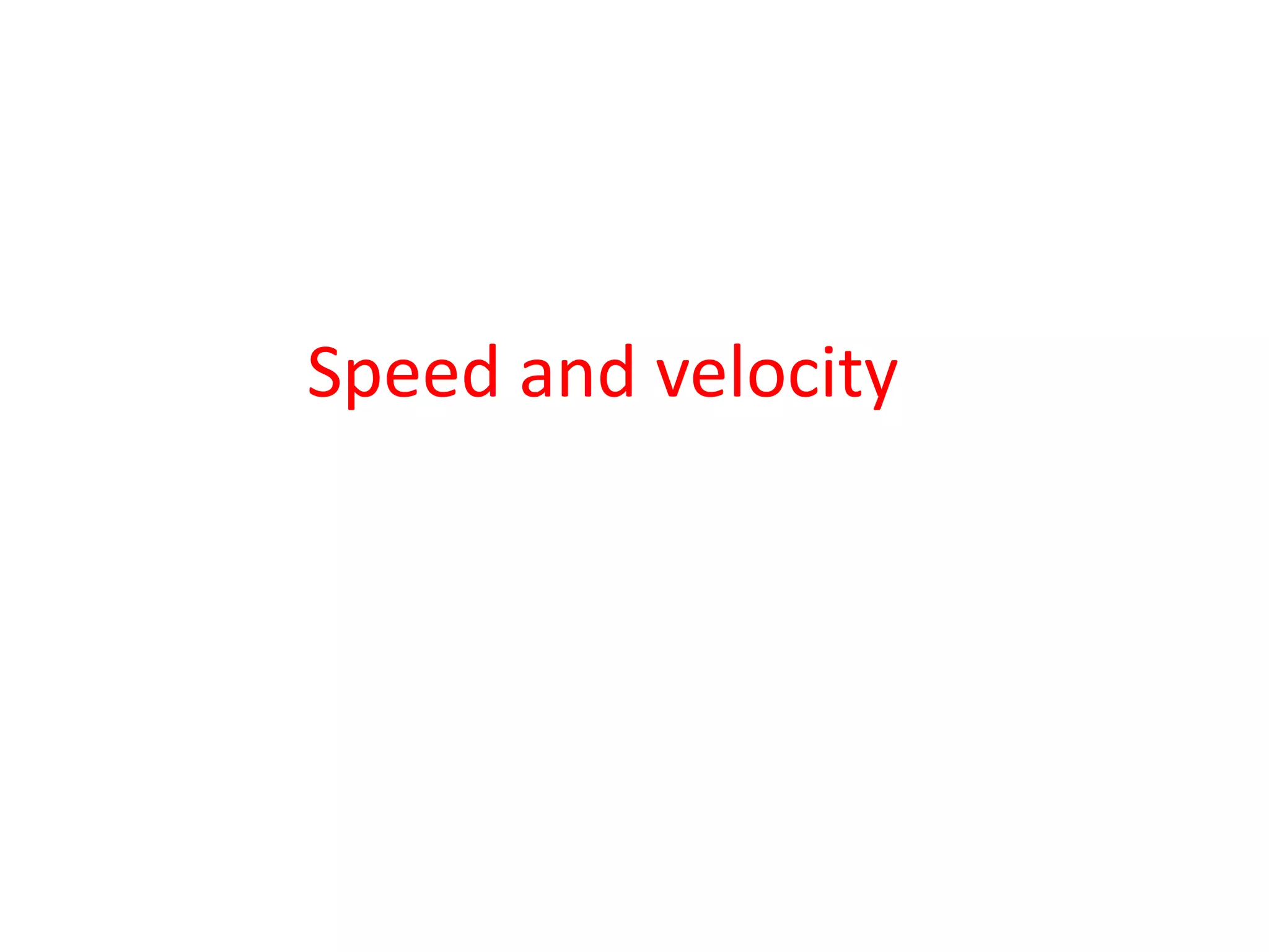 This document discusses speed and velocity. It defines speed as the distance moved per second, which is a scalar quantity measured in m/s. Velocity is defined as the rate of change of displacement, which is a vector quantity also measured in m/s. The document provides examples of calculating speed and velocity from distance and time measurements. It also includes graphs showing displacement and velocity over time to illustrate constant, accelerating, and decelerating motion.