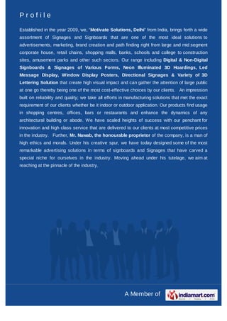 Motivate Solutions, based in Delhi, specializes in a wide variety of signage solutions including acrylic and stainless steel 3D letters, LED displays, and neon signs for applications in corporate, retail, and public sectors. Established in 2009, the company focuses on delivering high-quality, customized signboards designed to enhance brand visibility and direction-finding. Under the leadership of Mr. Nawab, the firm aims to achieve industry excellence through innovation and customer satisfaction.