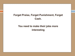 This document discusses motivating employees in the workplace. It outlines several key points: