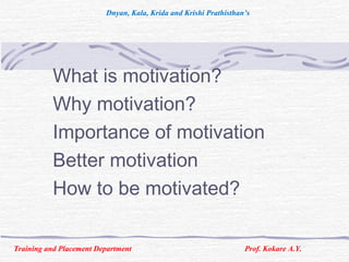 The document discusses the concept of motivation, its significance, and strategies for self-motivation. It outlines Abraham Maslow’s hierarchy of needs, the characteristics of self-actualized individuals, and provides goal-setting techniques to achieve personal and professional success. Additionally, it emphasizes persistence, responsibility, hard work, and creativity as essential components in reaching one’s goals.