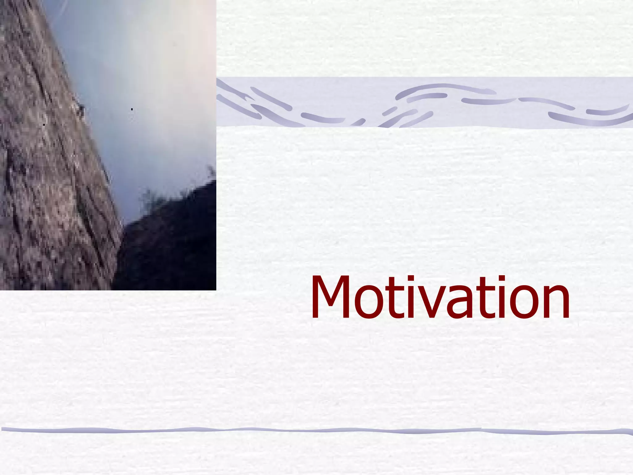 Motivation is an inferred process that causes an organism to move towards a goal. Abraham Maslow's hierarchy of needs proposes that people are motivated to fulfill basic physiological needs, safety needs, belongingness and love needs, esteem needs, and self-actualization needs. Self-motivation involves breaking tasks into small steps and starting action without waiting for inspiration. Effective motivational strategies include finding new skills, getting feedback, expanding abilities, and rotating work assignments. Goal-setting is important for motivation and goals should be specific, measurable, attainable, relevant, time-oriented, and tangible. Short-term goals can be achieved quickly while long-term goals take more time.