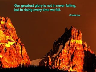 This document discusses the stories of many famous and successful individuals who initially faced rejection or failure but ultimately achieved great success and recognition. It describes how Colonel Sanders sold his fried chicken business for $15 million after years of rejection, and how Terry Fox raised $20 million for cancer research despite being forced to quit his cross-Canada run halfway due to the disease. Famous figures like Amitabh Bachchan, Dr. APJ Abdul Kalam, The Beatles, Marilyn Monroe, Elvis Presley, and Albert Einstein are also discussed and how they each faced rejection but went on to find great success.