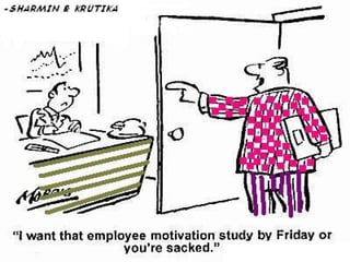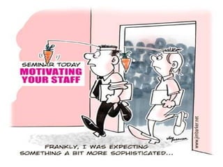 The document discusses different methods and theories of motivation. It defines motivation and outlines several factors that motivate employees both monetarily and non-monetarily. Some of the theories discussed include Maslow's hierarchy of needs theory and carrot and stick approach. The document also lists some indications of motivated employees and concludes that motivation is an important tool for managers but must be used competently.