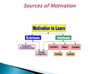 The document discusses motivation in students and its importance in education. It defines motivation and different types of motivation, including intrinsic and extrinsic motivation. Motivation is key to students' participation in class, attitude towards learning, and academic excellence. Motivated students have better behaviors and outcomes, while teachers who motivate students have more positive outlooks.