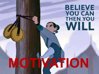 This document defines motivation and its key components, processes, features, importance, and types. It discusses motivation as the process that initiates and guides goal-oriented behaviors, involving biological, emotional, social and cognitive forces. The three major components of motivation are activation, persistence, and intensity. It also outlines several classic theories of motivation, including Maslow's hierarchy of needs, Herzberg's two-factor theory, and McGregor's Theory X and Theory Y. Motivation is important for productive use of resources, increased efficiency and output, achievement of goals, and development of relationships.