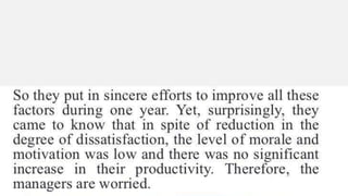 2. The document outlines different theories of motivation including Maslow's hierarchy of needs and intrinsic vs extrinsic motivation. It also discusses the elements, characteristics, qualities, and process of motivation.