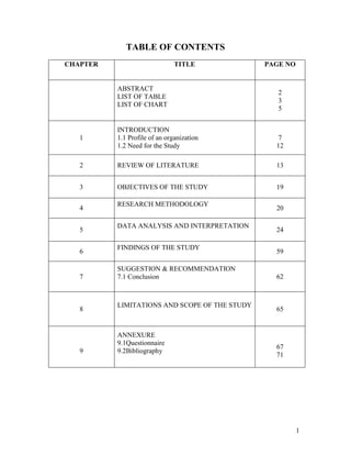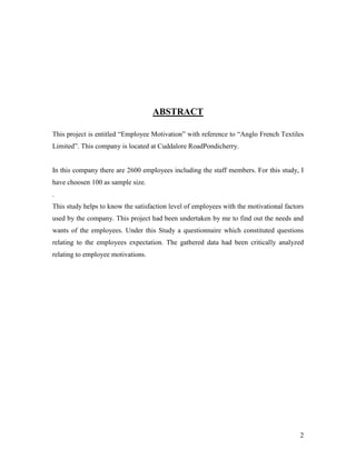 This document provides the table of contents for a study on employee motivation at Anglo French Textiles Limited. It includes 22 tables and charts that analyze factors related to employee motivation, satisfaction, and productivity. The study aims to understand employee needs and expectations to reinforce motivational factors used by the company.