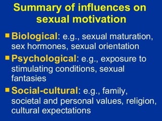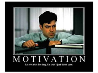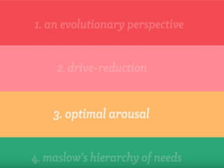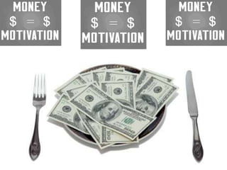 The document discusses various theories of motivation, including drives to satisfy biological needs like hunger and sex, as well as the need to belong. It covers motivations at both the biological and psychological levels, such as instincts, arousal theory, Maslow's hierarchy of needs, and theories of work motivation. Key motivators discussed include basic drives, achievement, and belongingness.