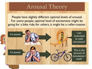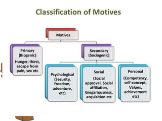 The document discusses the concept of motivation, defining it as an internal force that compels individuals to act in order to satisfy needs or goals. It categorizes motives into physiological, social, and personal types, and outlines various theories of motivation including instinct theory, drive theory, arousal theory, incentive theory, and Maslow's hierarchy of needs. Ultimately, it emphasizes that motives play a crucial role in energizing, directing, and sustaining behavior.