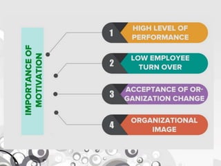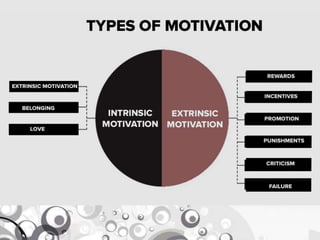 This document discusses motivation in the workplace. It begins by defining motivation and explaining that motivation can be intrinsic, arising from internal factors, or extrinsic, arising from external rewards or punishments. It then lists some key factors that affect employee motivation, both positively such as achievement, growth, and responsibility, and negatively such as company policies and personal life. The document concludes by outlining several motivation techniques for managers to use, including asking for employee input, validating good work, celebrating milestones, and offering an incentive program.