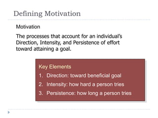 The document discusses several theories of motivation: