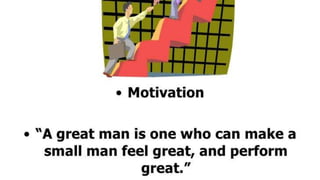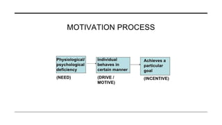 Motivation is defined as the driving force that initiates and directs behavior. It comes from internal needs and desires like biological needs for food and water or psychosocial needs for love and belonging. Motivation theories propose that humans are motivated to reduce drives or attain incentives. Key theories include drive theory which states behaviors are motivated by physiological drives, and incentive theory where external rewards motivate behavior. Maslow's hierarchy of needs proposes humans are motivated to fulfill basic needs before pursuing higher level needs like self-actualization. Understanding human motivation helps nurses recognize patient needs and build relationships to promote healing.
