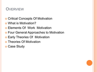 Motivation is influenced by cultural and situational factors. There are three elements of work motivation: direction of behavior, level of effort, and level of persistence when facing obstacles. Early motivation theories include Maslow's hierarchy of needs, McGregor's Theory X and Y, and Herzberg's motivation-hygiene theory. Motivation can be intrinsic or extrinsic. Goal setting theory proposes that goals direct behavior when people are aware of goals and accept them. Reinforcement theory states that behaviors are strengthened by their consequences. SAS Institute motivates employees through equitable financial rewards, a supportive work environment, and benefits beyond compensation.