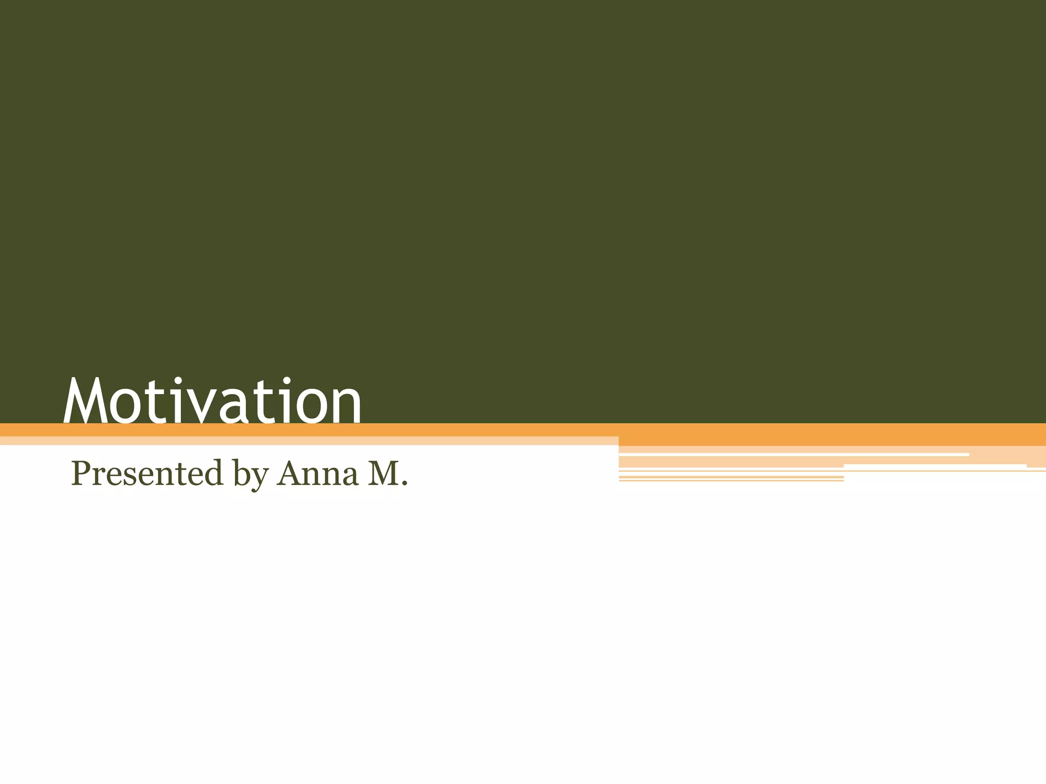 Motivation refers to internal states and conditions that influence behavior and give it direction in relation to physiological conditions, interests, attitudes, and aspirations. There are two components of motivation: needs, which arise from deficits within an individual, and drives, which are observable behaviors based on needs. Motivation functions by activating individuals, directing and regulating behavior, and selecting mechanisms. There are several theories of motivation including instinct theory, psychoanalytic theory, incentive theory, arousal theory, association theory, humanistic theory, cognitive theory, self-efficacy theory, and self-determination theory. Motivation can also be intrinsic, promoted by internal desires, or extrinsic, promoted by external factors. Motives are classified as physiological or psychological. Mas