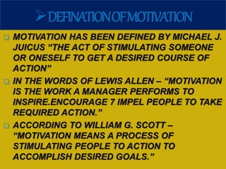 The document defines motivation as stimulating action to achieve goals according to several authors. It discusses types of motivation including positive motivation using rewards and negative motivation using fear. Motivation theories covered include Maslow's hierarchy of needs, Vroom's expectancy theory, McClelland's need for achievement theory, and Herzberg's two-factor theory distinguishing between motivators and hygiene factors. The document also compares McGregor's Theory X and Theory Y assumptions about human motivation.