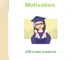 The document discusses different types of motivation, including intrinsic motivation based on curiosity and accomplishment and extrinsic motivation based on peer pressure and anxiety. It also lists some factors that can cause lack of motivation, such as low self-esteem, lack of family support, and low expectations. Finally, it provides tips for staying motivated when studying, such as reminding yourself of your purpose, managing your time well, and realizing that knowledge is empowering.