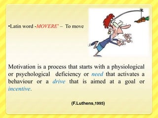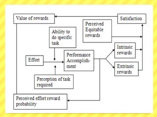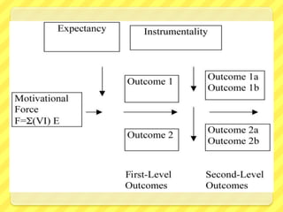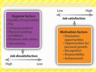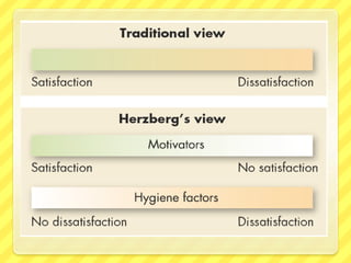 - Herzberg's two-factor theory which identifies motivators related to job content and hygiene factors related to job context that prevent dissatisfaction but don't motivate.