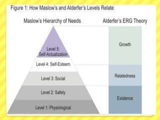 - Maslow's hierarchy of needs which identifies physiological, safety, social, esteem, and self-actualization needs. It proposes that lower level needs must be satisfied before higher needs.